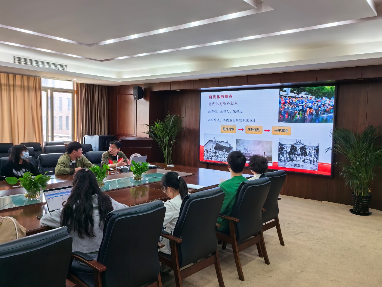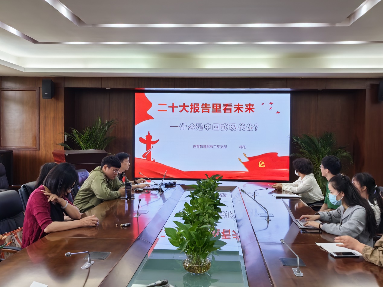 2023年6月7日下午,为学习贯彻习近平新时代中国特色社会主义思想主题教育,深入学习贯彻党的二十大精神,体育教育系教工党支部在实验C楼307开展“二十大报告里看未来——什么是中国式现代化?”专题党课学习活动。党课由体育教育系教工党支部书记杨阳主讲,参与活动的还有董翠香、尹志华、胡玉姣、张喆、韦娜娜等教工党员,以及2020级学硕研究生党支部党员们。